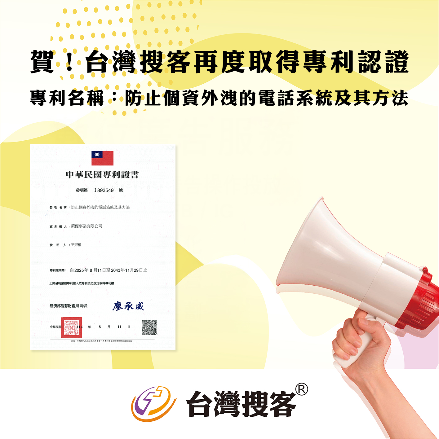 填寫諮詢單 填寫諮詢單 填寫諮詢單 2026工商禮贈品已上市,商品種類繁多,歡迎來電洽詢!精選多款工商禮贈品,兼具實用與質感,適合企業採購、客戶關懷,提供專屬客製化服務,幫助品牌建立專業形象。 閱讀更多 賀!台灣搜客再度取得專利認證專利名稱:防止個資外洩的電話系統及其方法 閱讀更多 數位廣告服務正式上線為您的品牌拓展新市場,完整規劃廣告預算與策略、精準鎖定目標TA,透過廣告投放加強品牌曝光度,觸及更多潛在用戶。 閱讀更多 專為補教業者設計的AI電話語音機器人招生旺季即將到來,您還在煩惱招生電話該怎麼打嗎? 試試人機協作的 AI 電話語音機器人搜客雲吧! 閱讀更多 全力配合政府打詐,台灣搜客將落實身分認証 (KYC)為配合國家通訊傳播委員會 NCC 落實電信事業受理申辦電信服務「風險管理機制指引」(簡稱 KYC),針對尚未完成 KYC 之用戶,則暫停提供一切服務。 閱讀更多